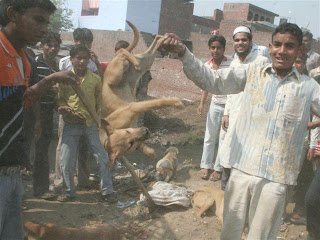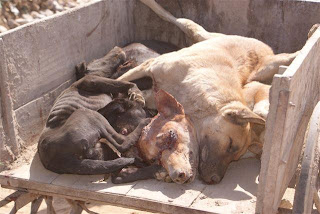 Here is an actual photo of a dog being hog-tied so it can be beaten to death to bring out the "flavor" of the meat. It is also a delightful spectator sport since people at the market gather around with smiles and giggles delighting in the torture of the victim.
