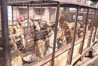 Dogs caged at the meat market awaiting their fate. Usually being clubed to death with long poles. The Chinese actually take a particuliar delight in torturing their dinner victims before butchering them and eating them.